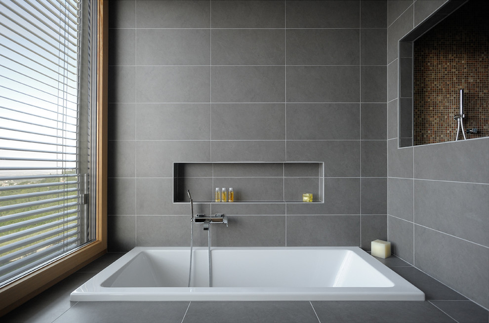 Bricks & Masonry · built in alcove shelf · casaclima · gray · large window · massive · modern · mosaic tile · single house · sleek